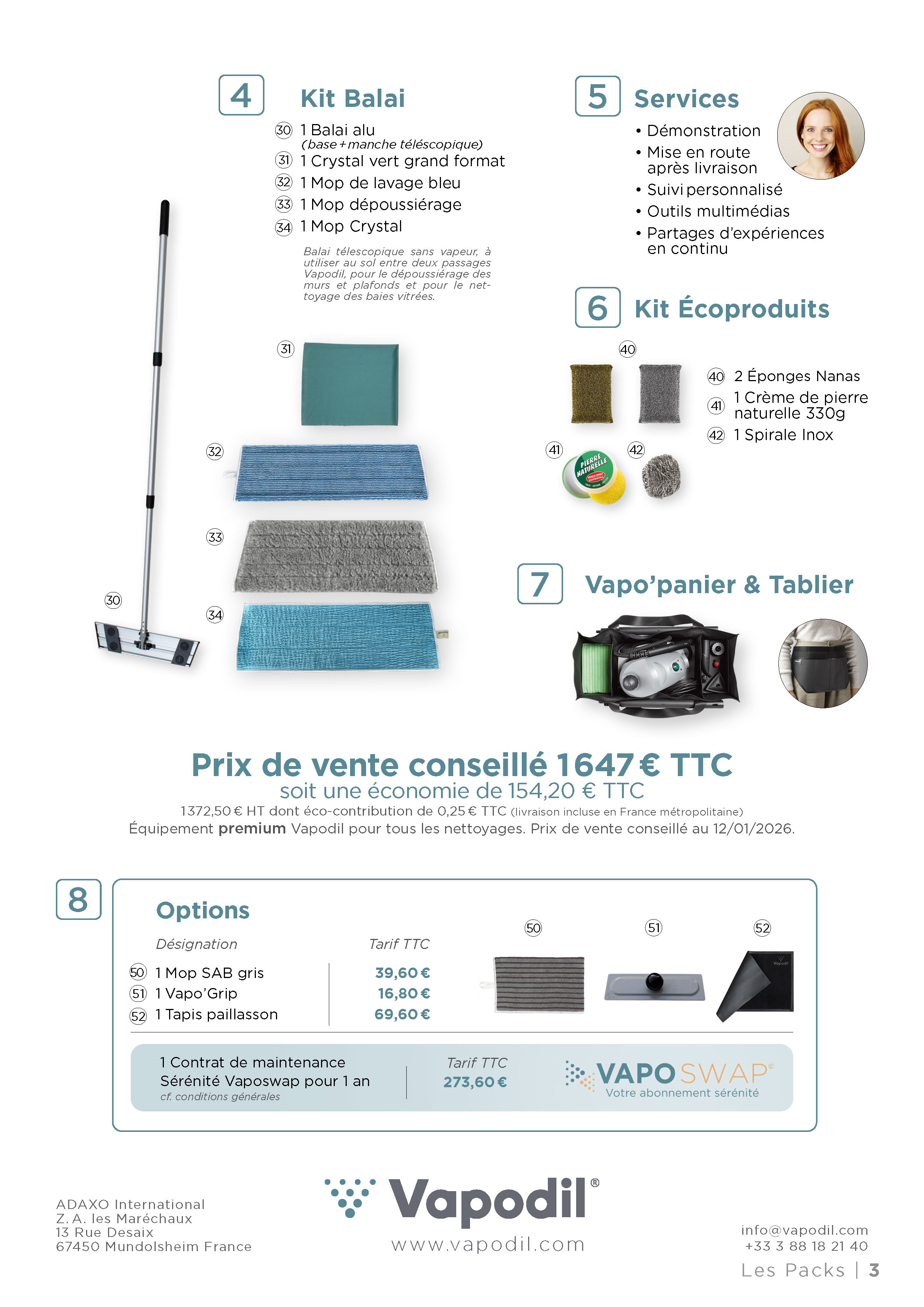 Autour du Nettoyeur Vapeur Sèche (NVS), il rassemble l’ensemble des accessoires, microfibres (MFV), compléments et écoproduits, ainsi que les services Vapodil®, pour répondre à tous les usages, même les plus exigeants.